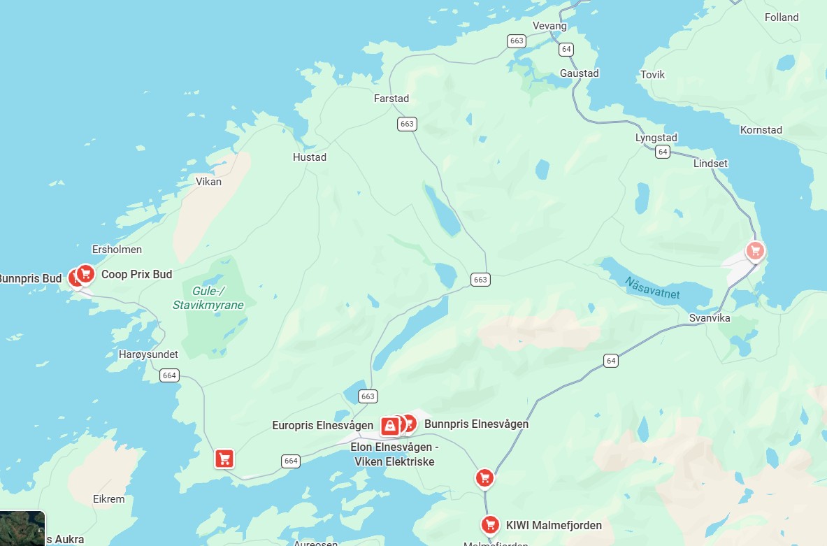 - Bunnpris Elnesvågen – Dalelia 12, 6440 Elnesvågen(søndagsåpent)